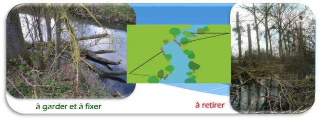 L'enlèvement des embâcles n'est toutefois pas systématiquement nécessaire. A condition qu'ils ne provoquent pas un barrage dans le lit, certains embâcles peuvent être conservés et fixés. Car, non seulement, ils participent à la mise en place de l'hydrodynamique d'étiage nécessaire à limiter les dépôts de vase, mais ils constituent également un habitat de choix fréquenté par les insectes aquatiques, les poissons et les oiseaux.