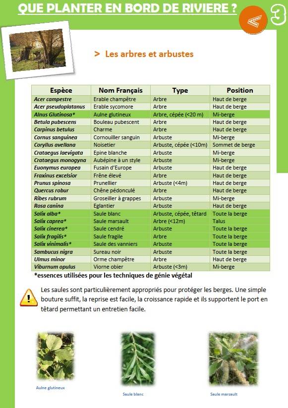 Document synthétique (2p) présentant les principales espèces (arborées, arbustives, herbacées) des rives de la région